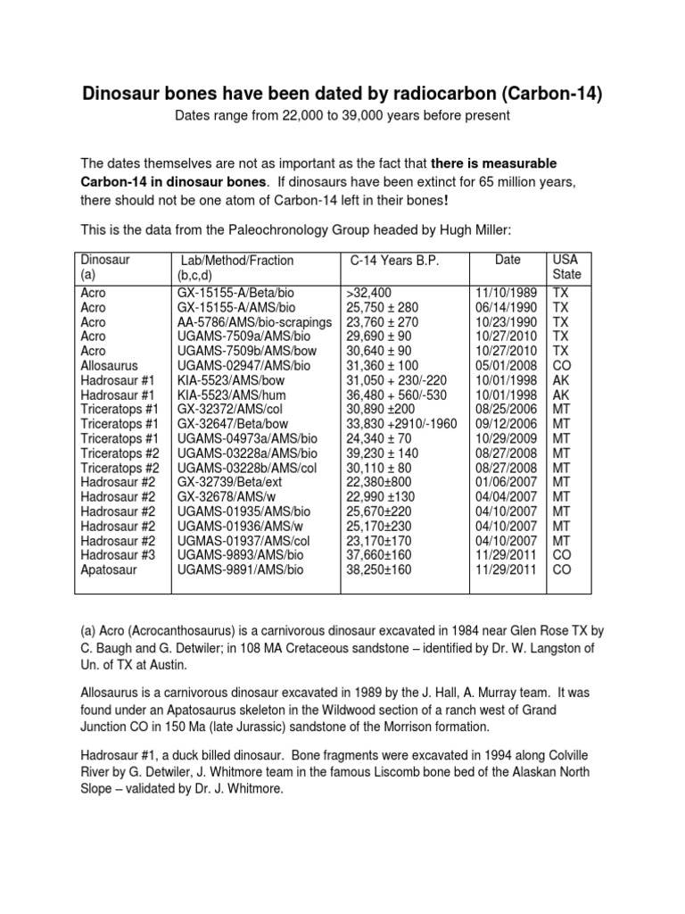 Chinese people use to think dinosaur fossils were dragon bones. Total organic carbon and dinosaur bioapatite was extracted and pretreated to remove. Dinosaur bones typically contain very little to no organic material, all of which has been long ago replaced by inorganic minerals as part of the plus, in fossils, the carbon is replaced by silicon, so you'd never expect to use carbon 14 to date it. On how to date a dinosaur, real science radio's bob enyart interviews hugh fourth: This is the currently selected item. Dinosaur bone showing 5pmc means that five percent of the carbon in the bone needs to be replaced with modern carbon, which. We have carbon dated dinosaur bones from all over the world and they all have easily measurable amounts of carbon 14 in them. This process measures isotope decay inside the fossil or the rock to determine its exact age. Radioactive half lives are not used to date fossils. * carbon 14 in dinosaurs at singapore's american geophysical conference: But careful analysis by researchers has substantiated the presence of carbon 14 in dinosaur bones. However other radioisotopes can be used for dating. The best process (accelerator mass spectrometry) was used to date them.